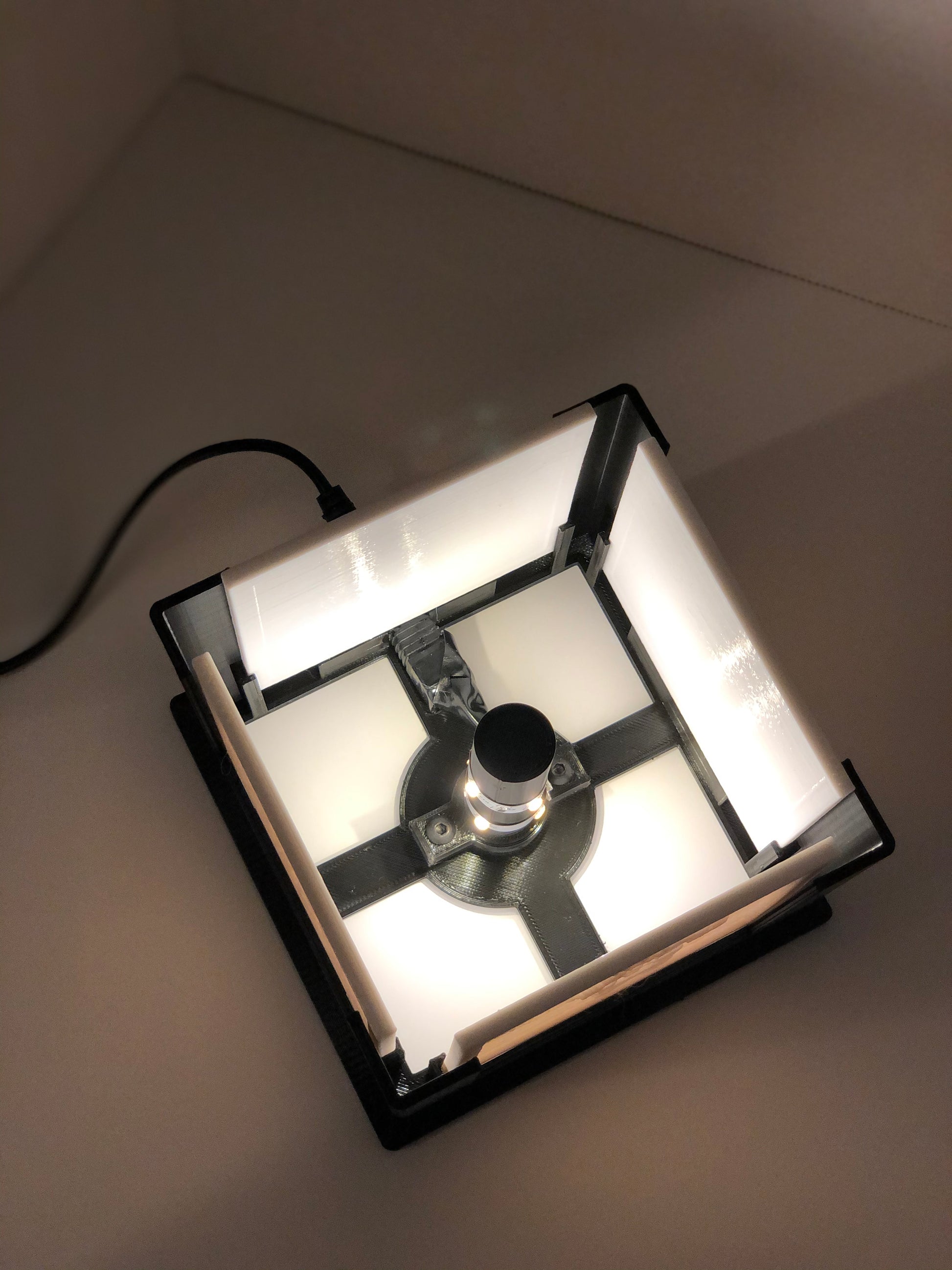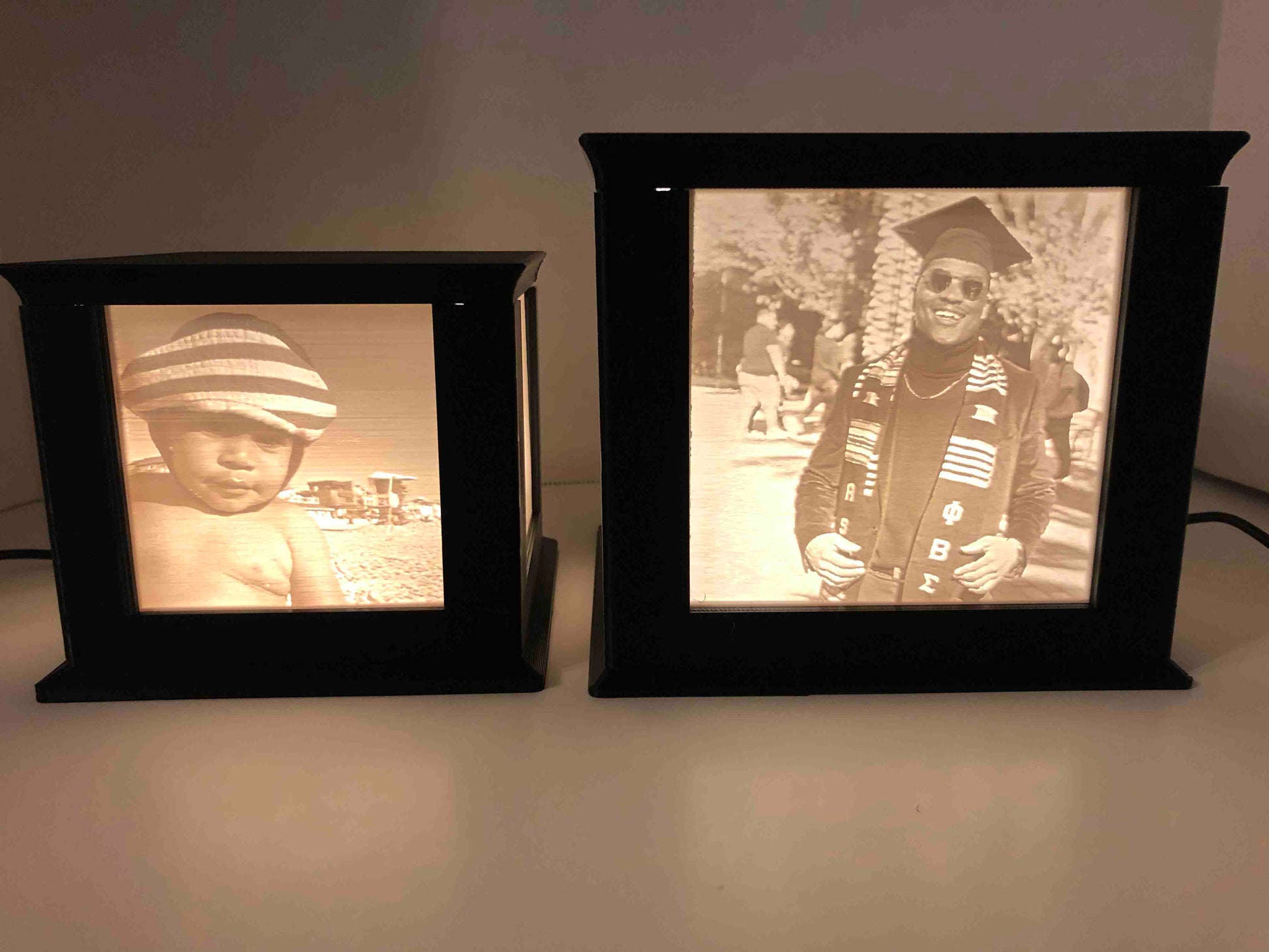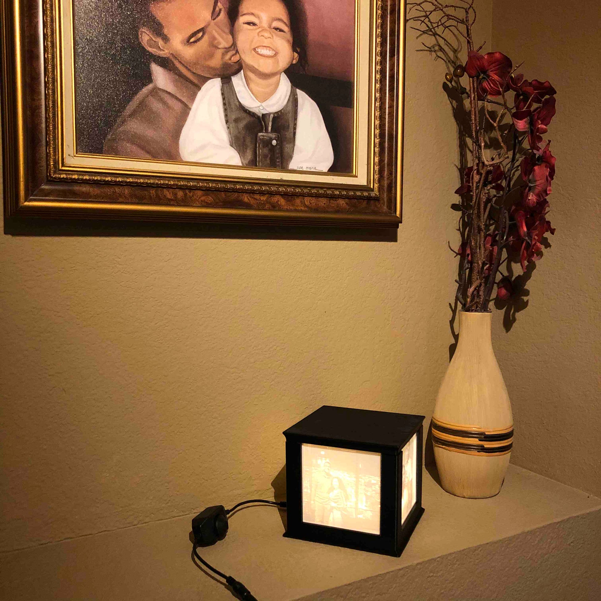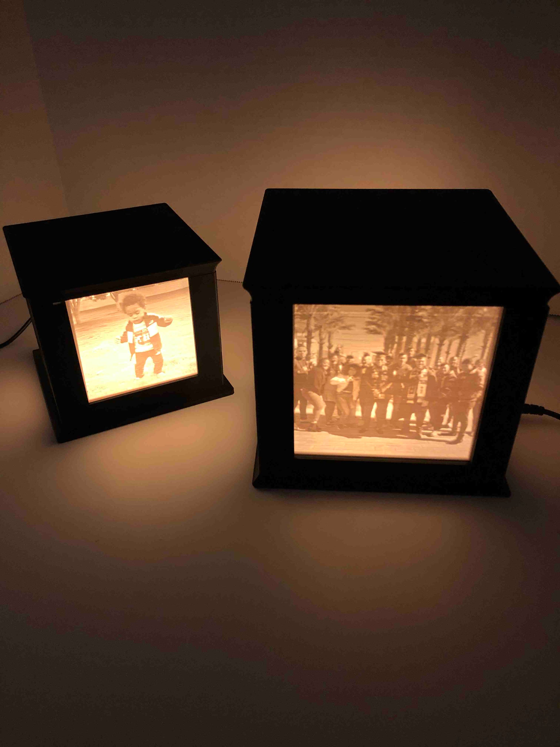 Each Memory Box is custom 3D printed and includes four photos with a 5mm border. The LEDs are powered by a 12v AC adapter that comes with an in-line on-off switch. Box dimensions are 6 x 6 x 5.5 inches.