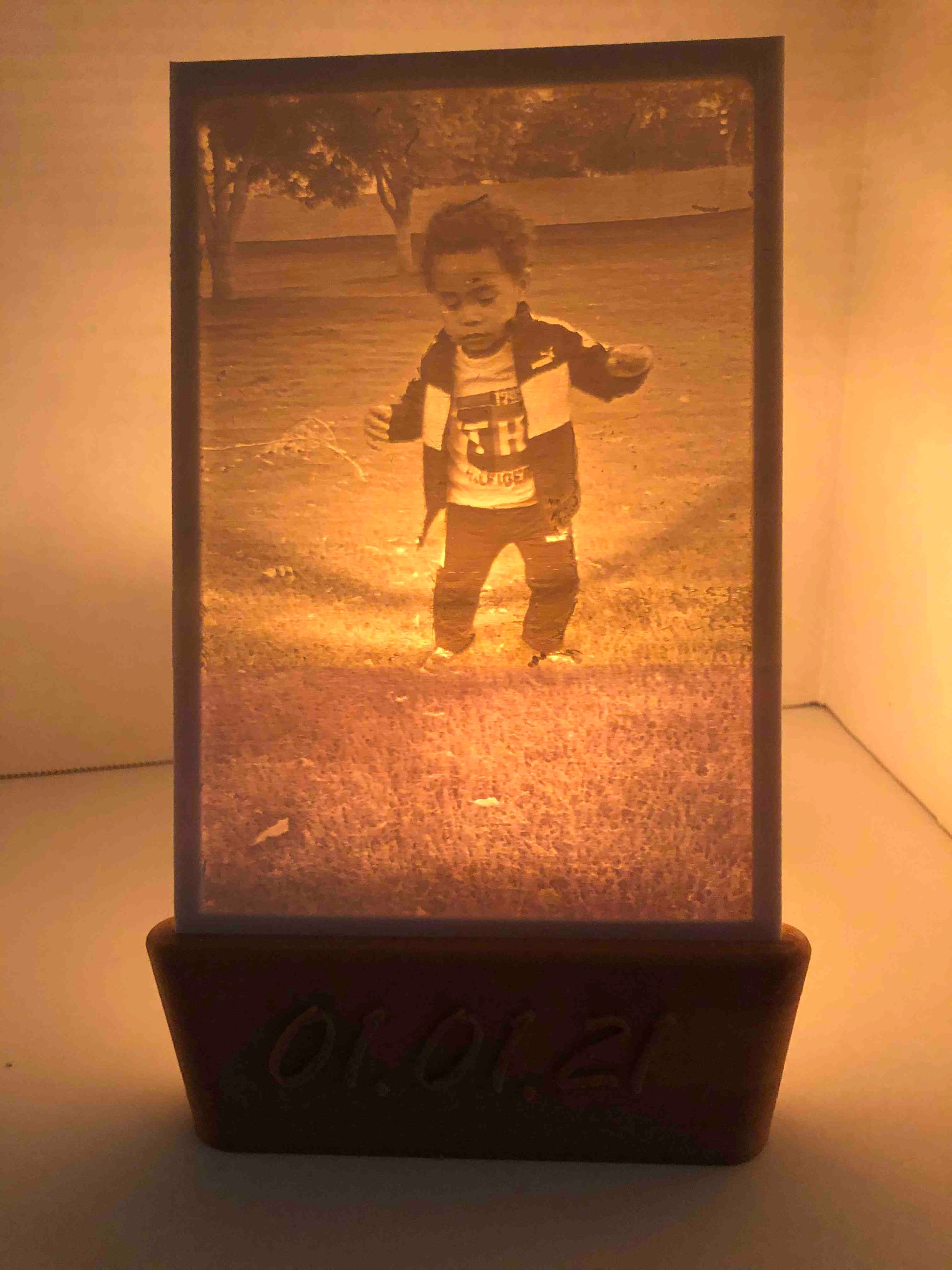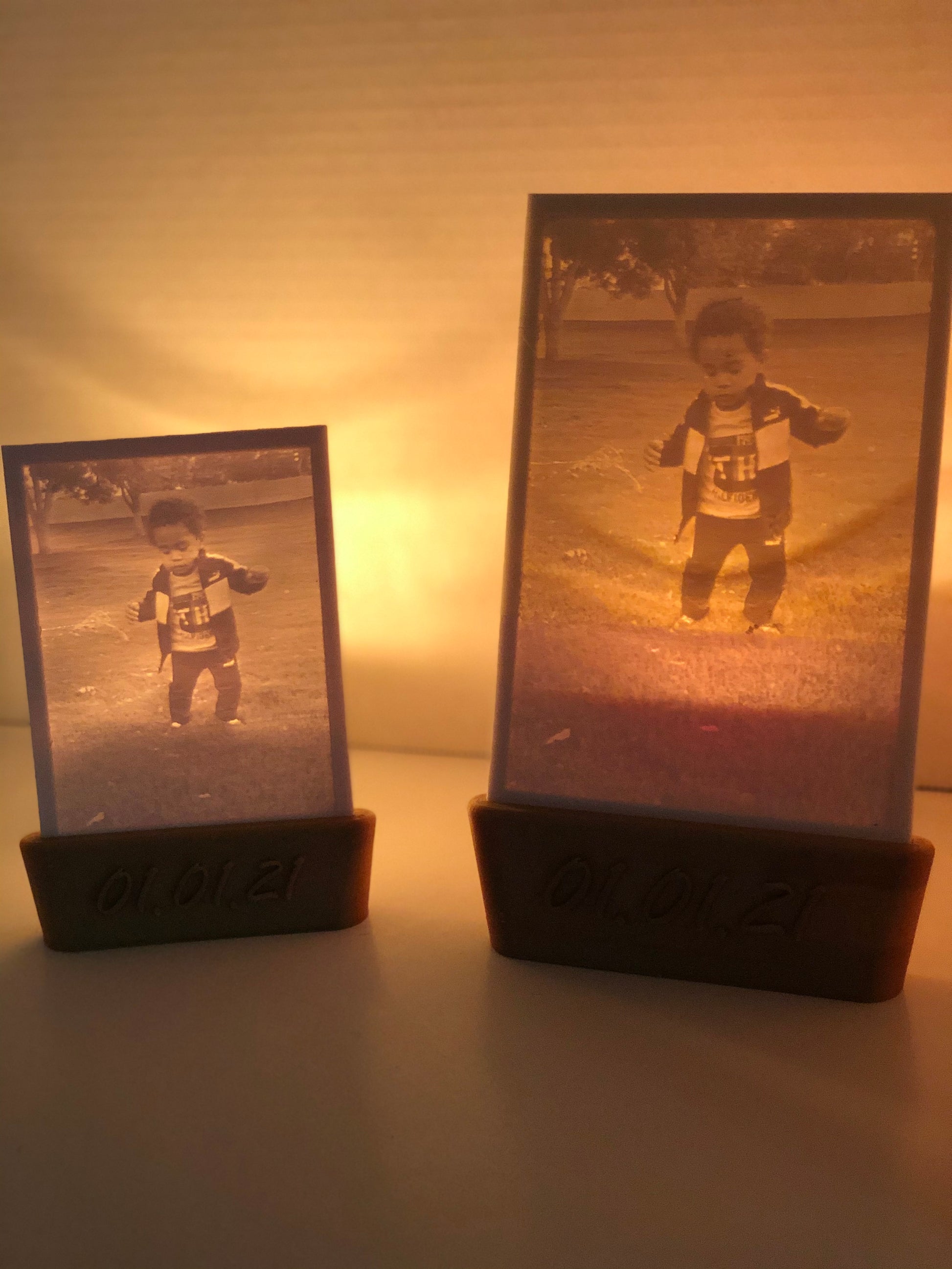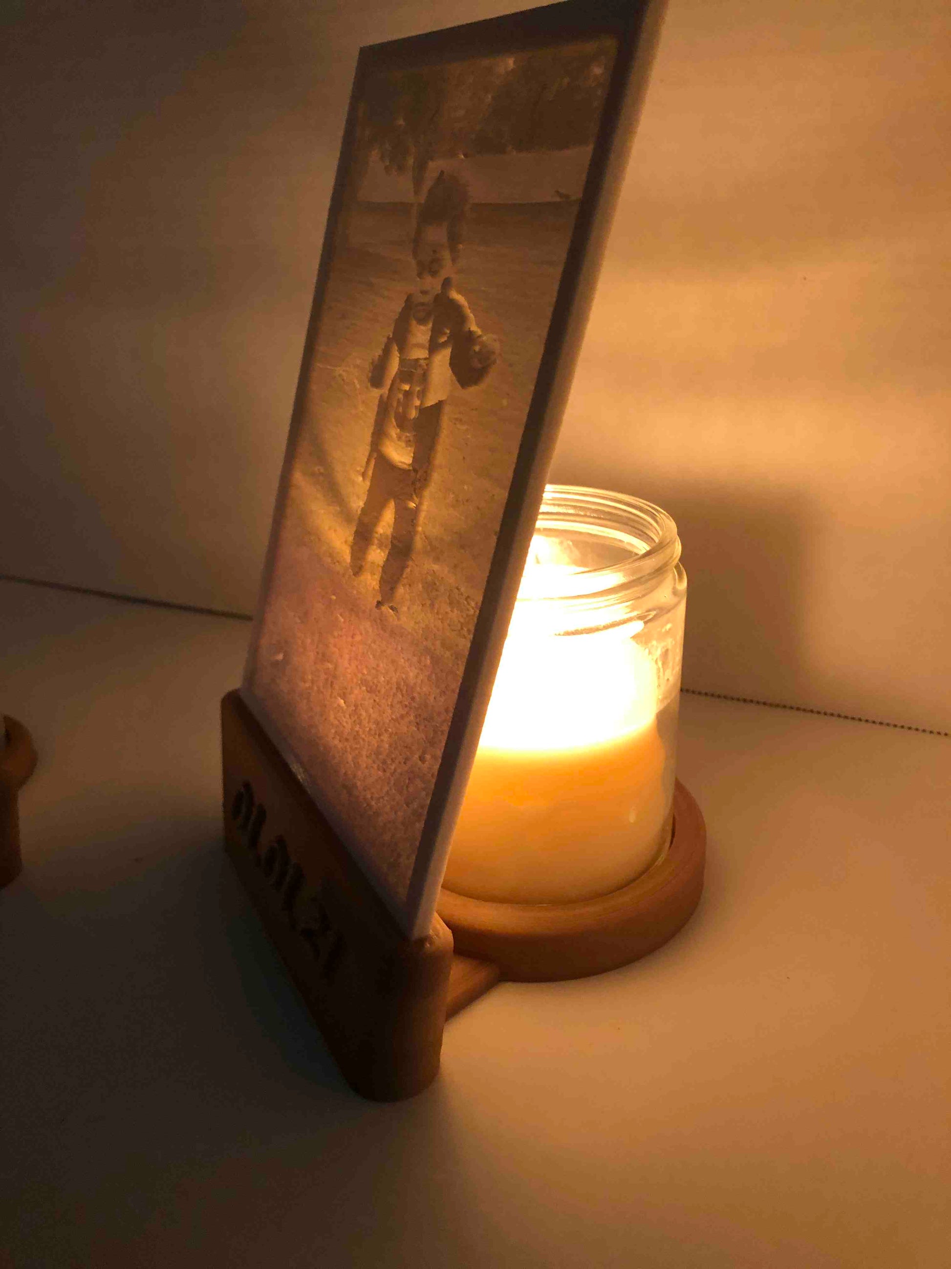 Add flare to your existing candle burning with a personalized candle base! The holder features a base for a candle and lithophane (3D photo), as well as the option to add a special date or caption to the base. This unique item makes for a very thoughtful gift. Your order comes with one lithophane and one candle base.